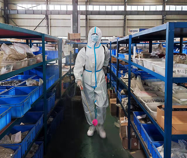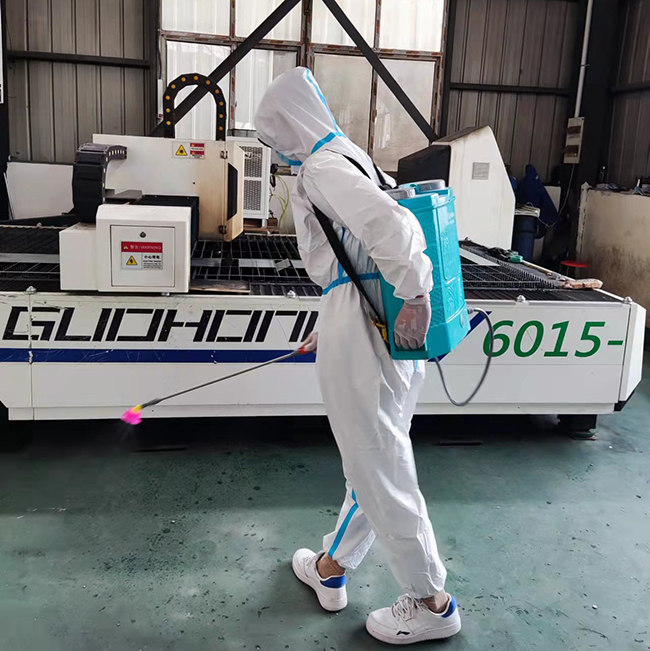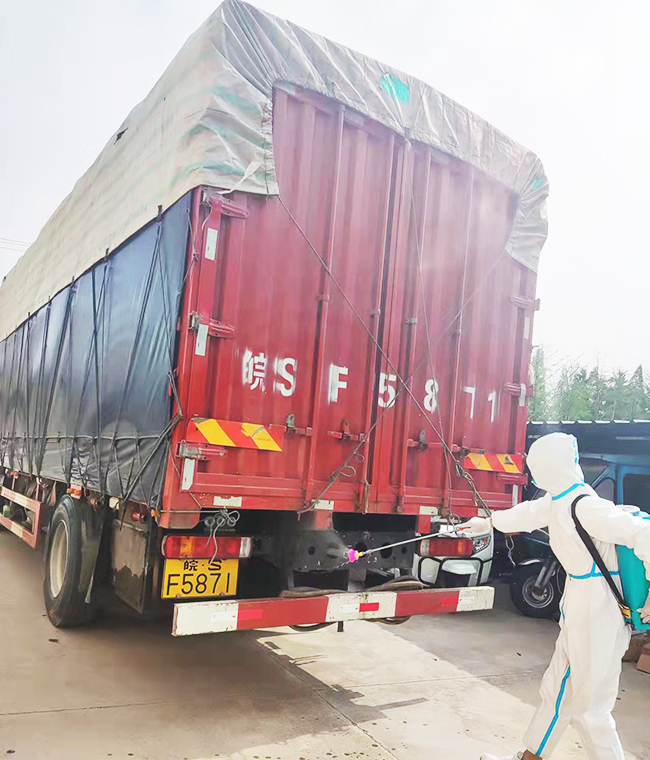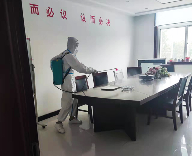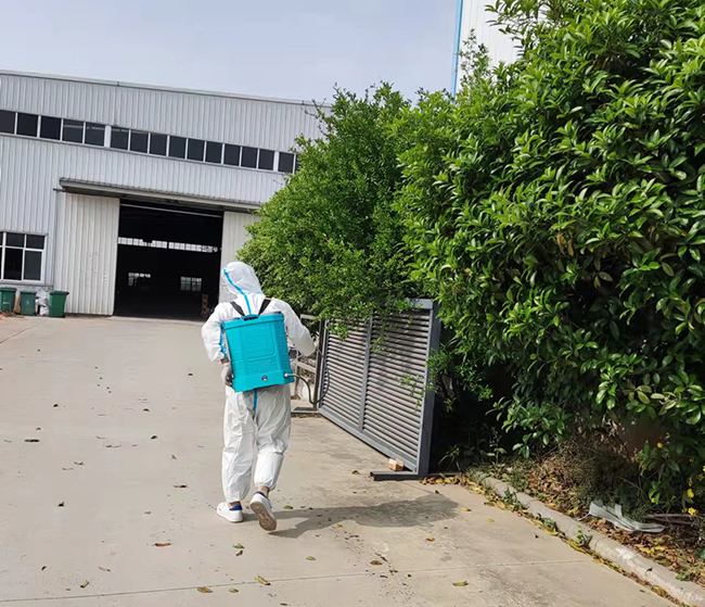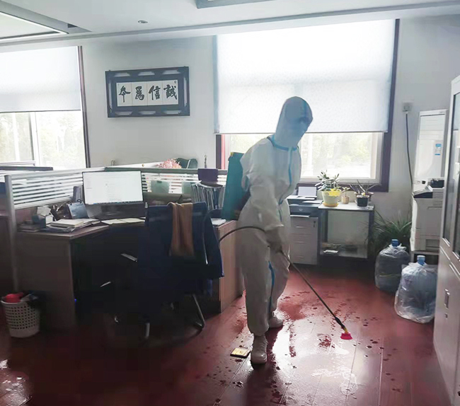 為確保公司各個部門在疫情期間的工作安全,防止疫情傳播,做好消毒防護工作,全公司進行了消毒消殺,消毒中為了不傷害員工身體健康,組織員工撤離現場,消毒人員佩戴口罩、乳膠手套、身穿防護服進行作業。