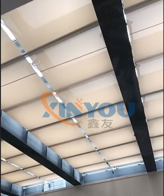 頂面系統選用FSS電動遮陽簾,即每套陽簾系統包含一套管狀的驅動電機和一套FSS專用的彈簧機構系統通過電機帶動卷繩器的旋轉拉動鋼絲,牽引面料,從而達到陽作用。電機反轉則可通過彈簧的反作用力收回面料,可實現采光效果。