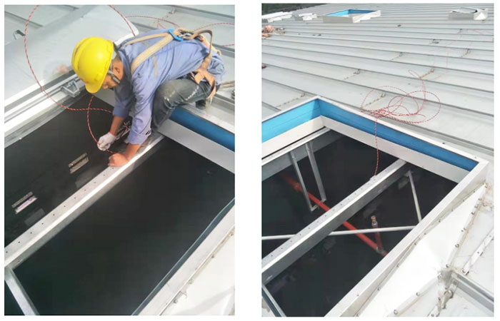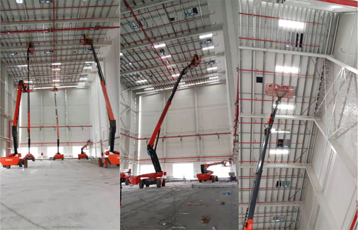徐州鑫友排煙天窗安裝團(tuán)隊(duì)入駐浙江5210物資公司寧波工廠,正式進(jìn)入PM包裝廠房,備品備件立體庫(kù)的圓拱形天窗施工安裝中。上圖為安裝人員利用升降車(chē)作業(yè)中。