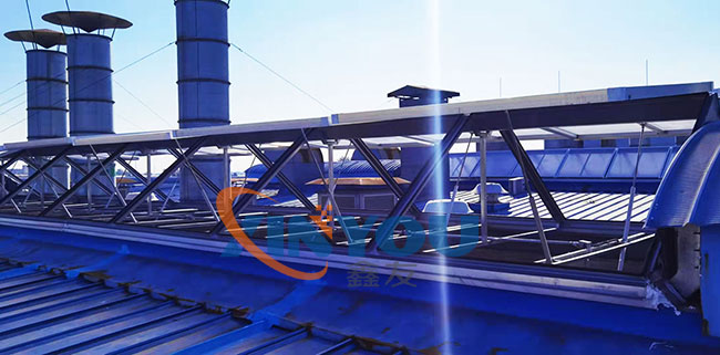 鑫友承接中車唐山8列動車組涂裝廠房電動采光排煙天窗的設備供應及安裝工程,天窗選擇鋁合金電動三角形采光排煙天窗,配置螺桿式開窗機,消防聯動控制箱。